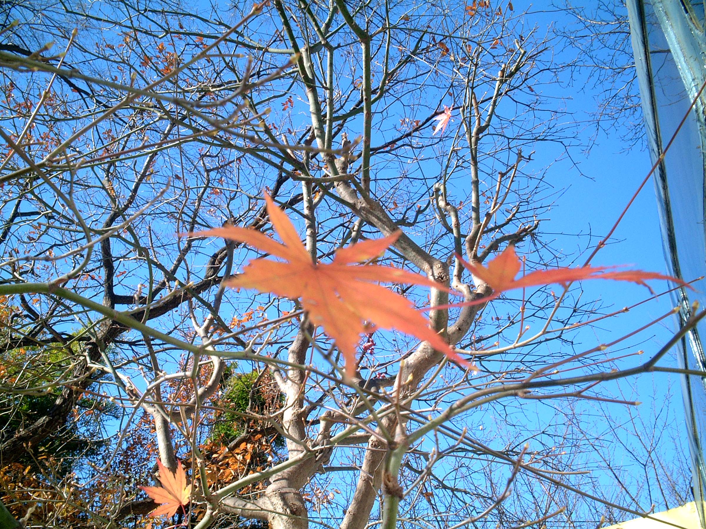 もみじが。ほんの数枚。細い枝にしがみつくように