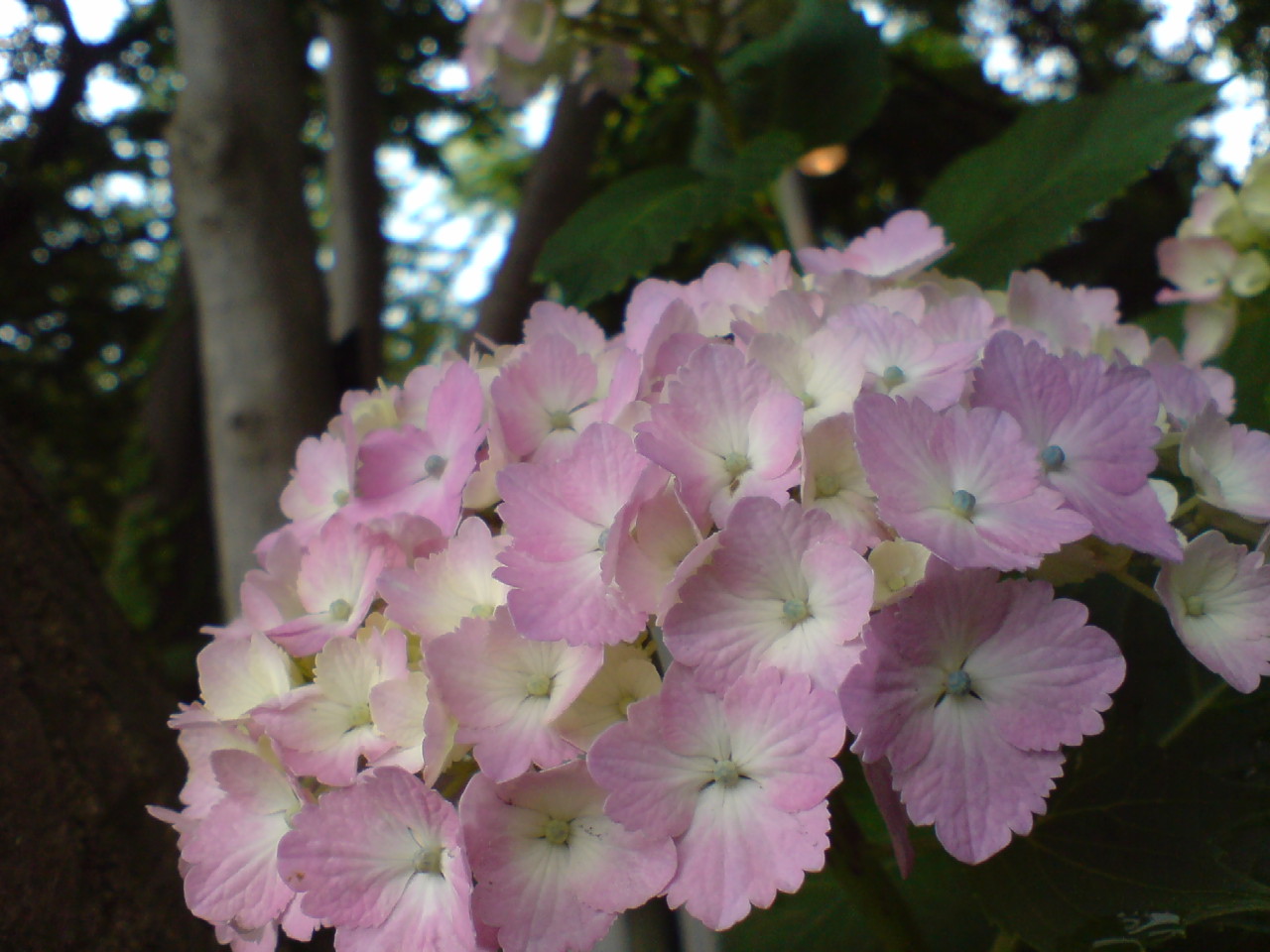 紫陽花もずいぶん華やかになりました。梅雨の合間の木漏れ日にキラキラしてます。
