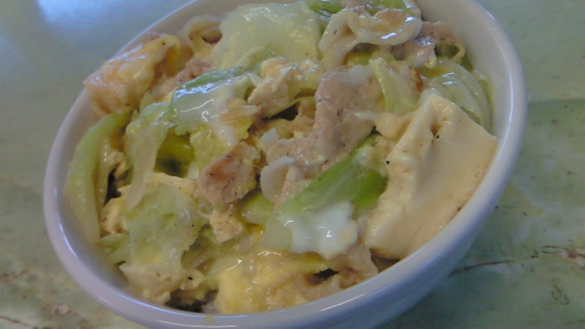 今日のまかないは『豚肉とキャベツと厚揚げの卵とじオイスターソース丼』ですっ!