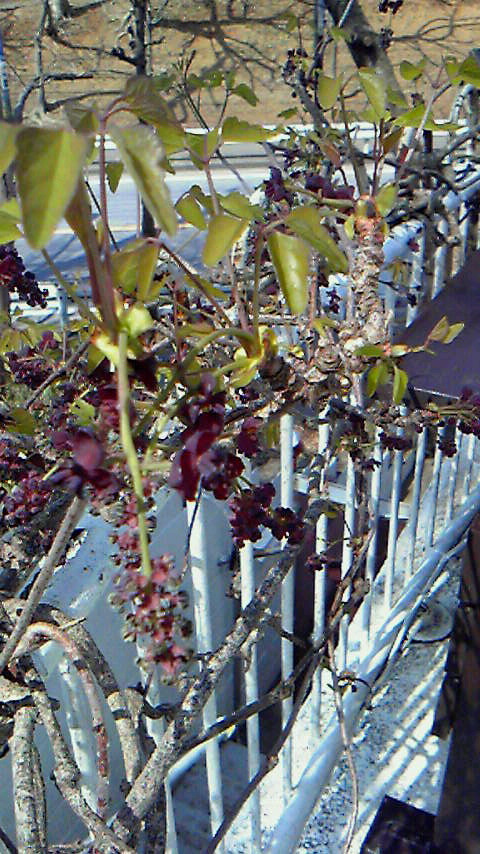 ついこの前まで丸坊主だったテラスのあけびに葉っぱがでて、花が咲いてきました。