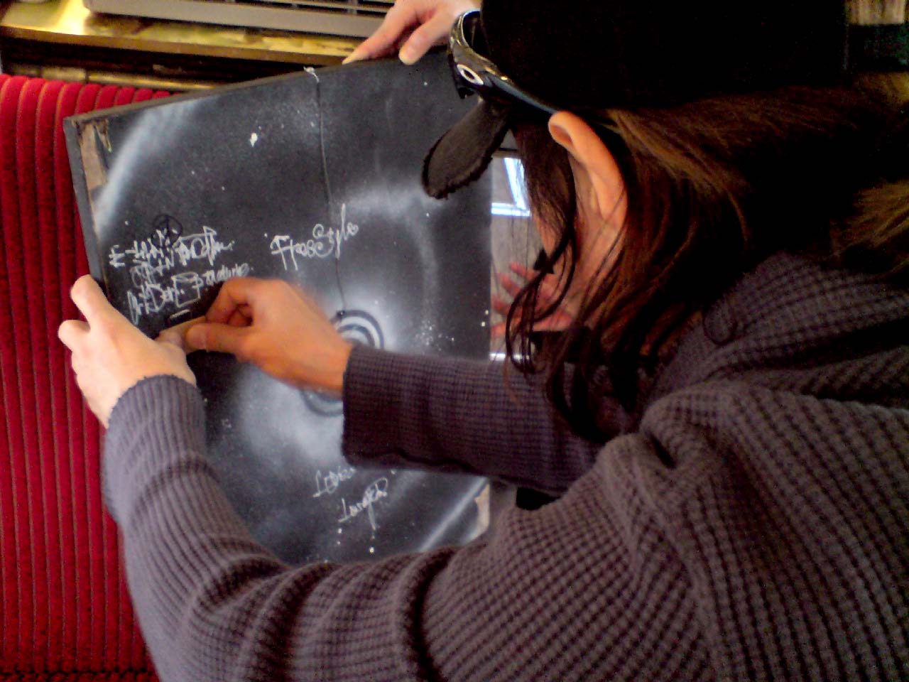 TRAINCAFE盛り上がっております!窓際に飾られたかわいい絵にうっとりしながらテンション高くfukuちゃんと一緒にはりきっております(^O^)/