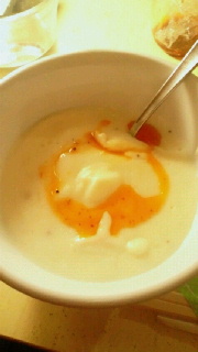 今日は午後から雨が降りだして、明日の昼過ぎまで天気がくずれるみたいですね。早速ですが、晩ご飯にジャガイモのポタージュを作って、その上にSPICY OILをかけて食べてみました………旨い)^o^(