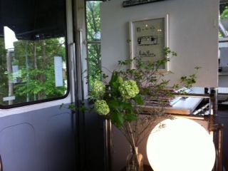 今日は少し肌寒い雨降りな日になりました。車内のお花を紫陽花にしたところだったので、ちょっと梅雨っぽい雰囲気(笑)。
